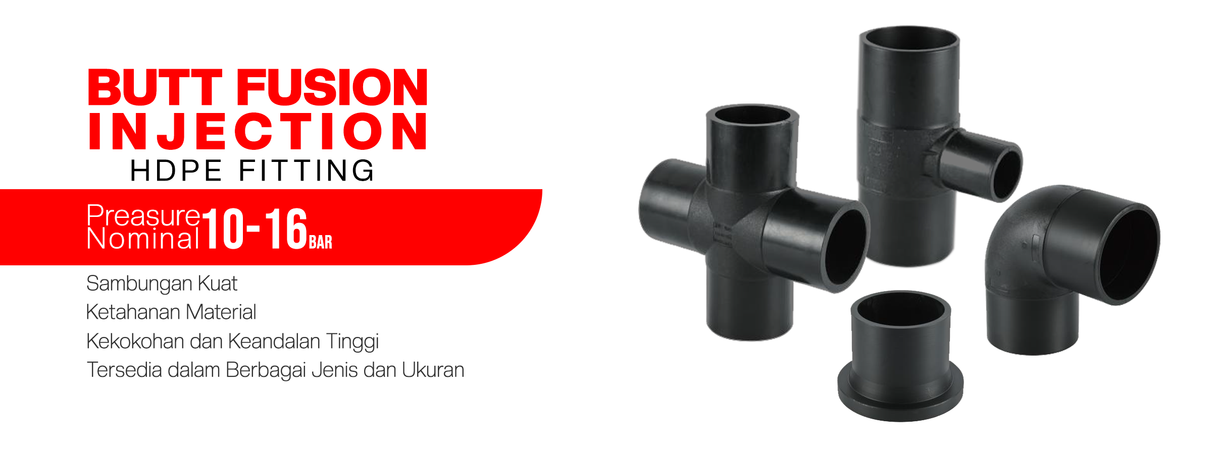 Fitting HDPE Butt Fusion Injection adalah komponen perpipaan yang dibuat dari bahan HDPE melalui teknologi injection, metode butt fusion merupakan cara penyambungan yang paling umum untuk menyambung pipa HDPE dengan pipa maupun fitting,diawali dengan meratakan kedua ujung pipa/fitting yang akan disambung lalu dipanaskan dengan mesin butt fusion pada suhu tertentu dan saling didorong untuk direkatkan, langkah terakhir adalah pendinginan. Didesain untuk aplikasi perpipaan yang memerlukan sambungan kuat, homogen, dan tahan lama. Fitting ini memastikan kekokohan, keandalan tinggi dalam menghadapi tekanan serta beragam kondisi lingkungan, ketahanan optimal terhadap korosi, kimia, dan suhu ekstrem. tersedia dalam berbagai ukuran dan jenis, menawarkan solusi efisien untuk penyambungan pipa HDPE yang memenuhi standard industri. Cocok untuk aplikasi umum dan proyek-proyek perpipaan yang mengharapkan kualitas tinggi dan hasil penyatuan yang konsisten.